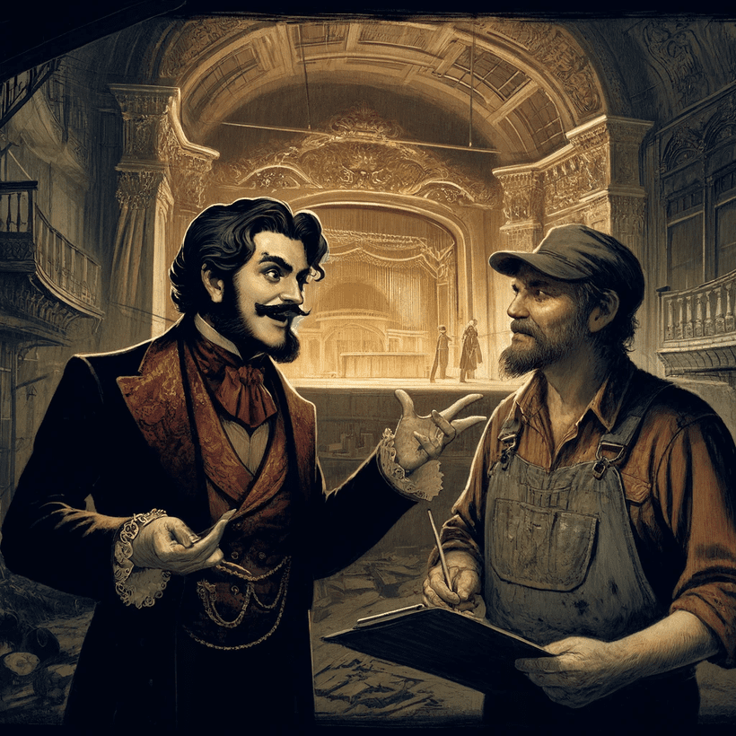 Alonzo lingered in the foyer, the last of the workmen filing past him, their tools and footsteps stirring the quiet dust. The light waned, casting longer shadows across the ornate floor, and Alonzo’s thoughts turned to the practicalities of bringing his theatre to life.
